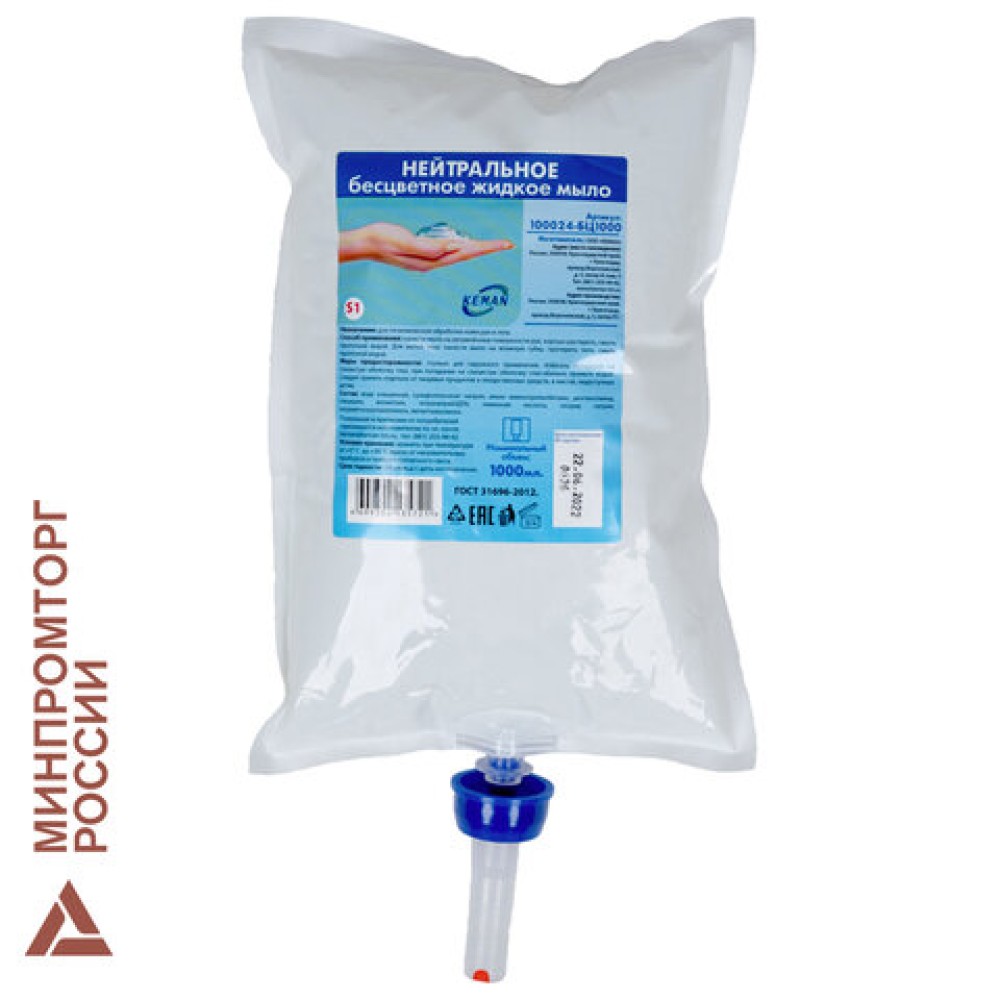 Картридж с жидким мылом одноразовый (Система S1) "Нейтральное", бесцветное, 1 л, KEMAN, 100024-БЦ1000 — купить в Екатеринбурге