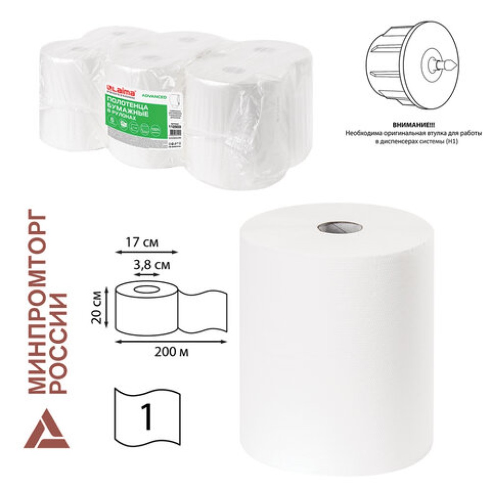 Полотенца бумажные рулонные 200 м, LAIMA (Система H1) ADVANCED, 1-слойные, белые, КОМПЛЕКТ 6 рулонов, 112503 в Екатеринбург — практичное решение для дома, офиса и бизнеса. Изготовлено из качественных материалов, отличается надёжностью и удобством в использовании.