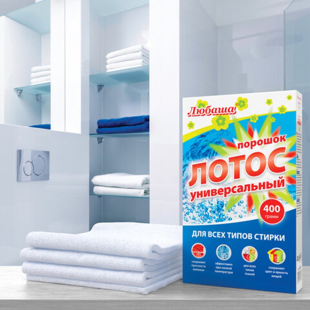Стиральный порошок для всех типов стирки 400 г ЛЮБАША "ЛОТОС", для всех типов тканей, 605568 в Екатеринбург — практичное решение для дома, офиса и бизнеса. Изготовлено из качественных материалов, отличается надёжностью и удобством в использовании.