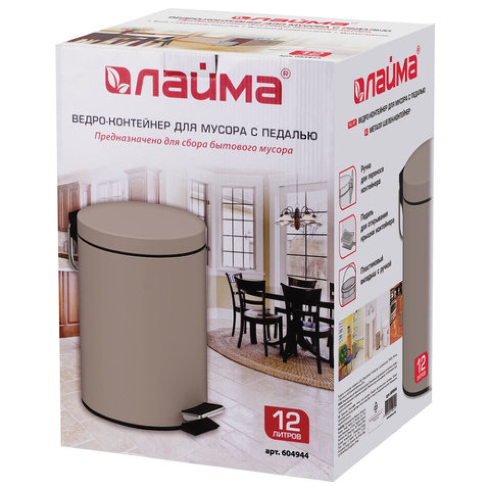 Ведро мусорное с педалью 12 литров "Classic", СЕРОЕ МАТОВОЕ, металлическое, со съемным внутренним ведром, LAIMA, 604944 — практичное решение для использования дома, в офисе и в коммерческих помещениях. Качественный материал обеспечивает долговечность и удобство эксплуатации.