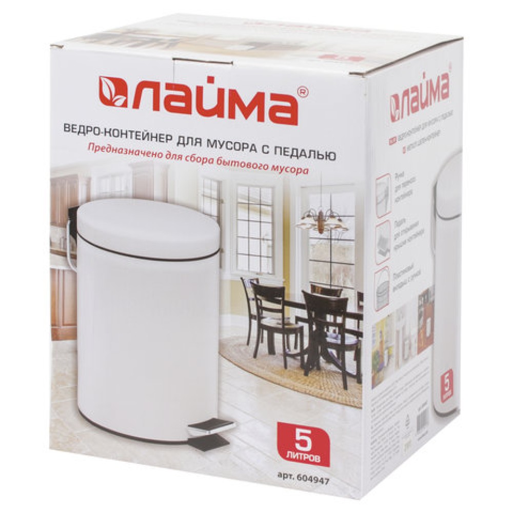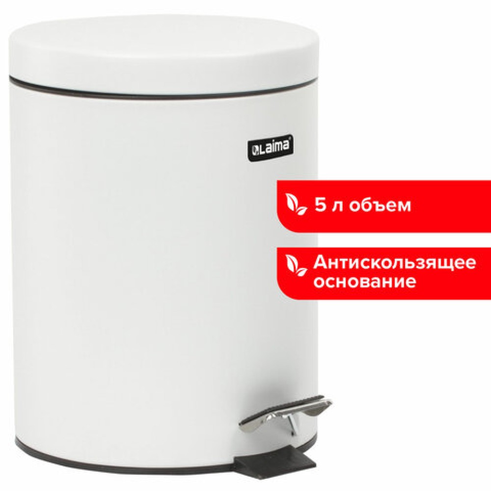 Ведро мусорное с педалью 5 литров "Classic", БЕЛОЕ ГЛЯНЦЕВОЕ, металлическое, со съемным внутренним ведром, LAIMA, 604947 — практичное решение для использования дома, в офисе и в коммерческих помещениях. Качественный материал обеспечивает долговечность и удобство эксплуатации.